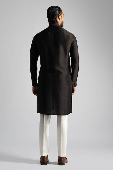 Brown kurta featuring thread embroidered floral petal motifs highlighted by crystals. Paired with a matching pant for a cohesive look.