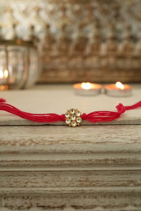 Red rakhi featuring a gold plated floral shape kundan embellished center