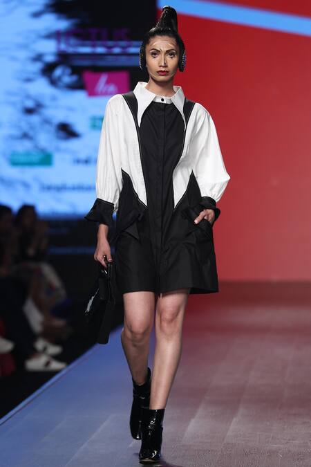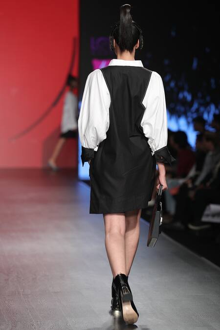 Black & white color block shirt dress with pocket detail.