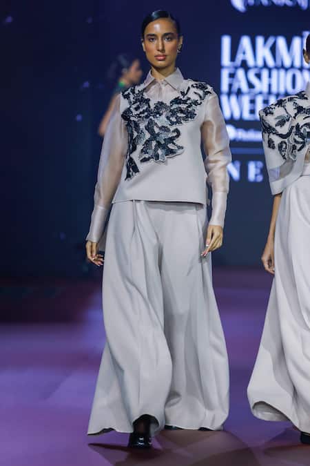 Buy_Pankaj & Nidhi_Pink Silk Organza Sequins, Embroidery Collared Fawn Semi Sheer Shirt _Online_at_Aza_Fashions
