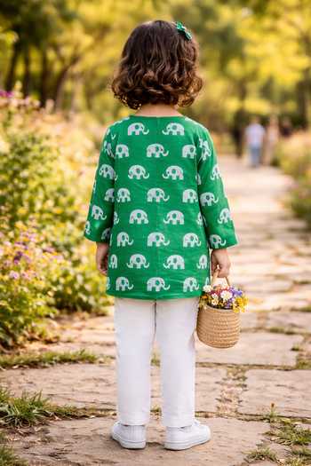 Green cotton kurta with elephant print motifs, paired with white pants.