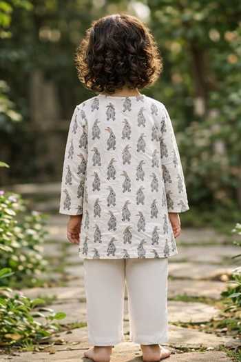 White cotton kurta with grey rabbit prints, paired with white cotton pants.