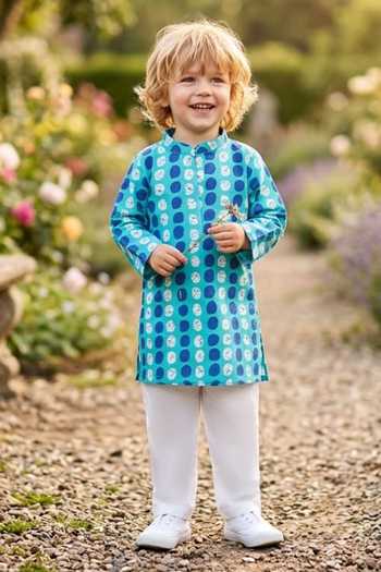 Blue Cotton Teal Polka Dot Print Kurta Set
