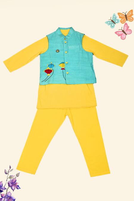 Green bundi featuring multicolor kite placement embroidered motifs. Paired with a yellow kurta and pant set, designed for comfort and style.