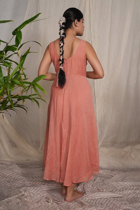 Peach Chanderi Embroidery Round Neck Paper Chikankari Dress