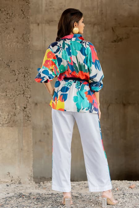 Blue puff sleeve shirt featuring a cinched waistline and an all-over paradise print. Paired with pants that have floral print panels and side pockets.