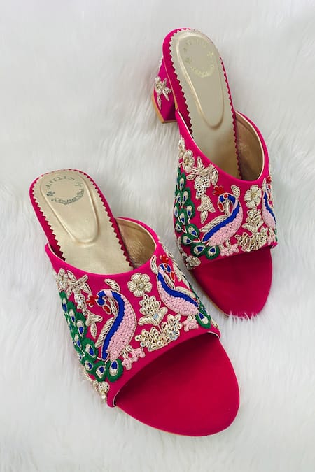 Pink block heels featuring floral and peacock embroidery with zari, beads, and sequins