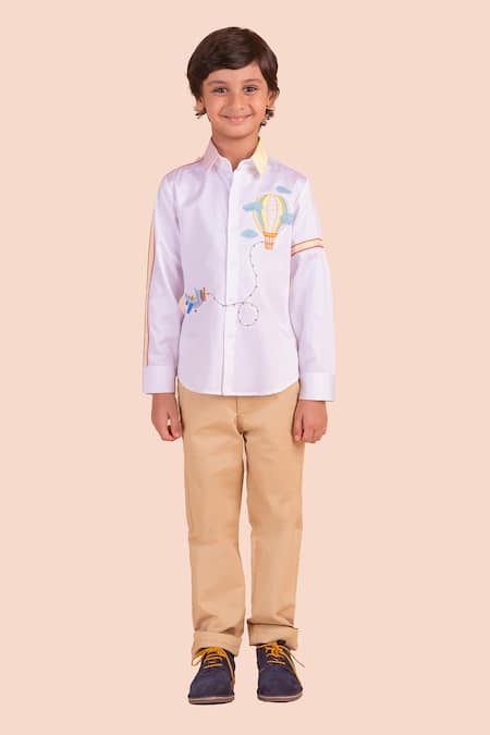 White shirt featuring hot air balloon and aeroplane motif embroidery