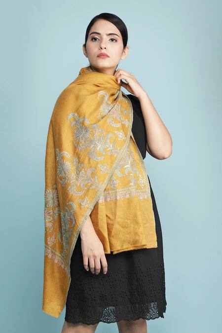Yellow stole with handwoven phool kari work, contrast hand embroidery, floral motifs & frayed ends.