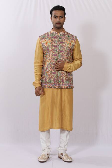 Dark mustard bundi with floral motifs in cashmere hand embroidery & patch pocket.