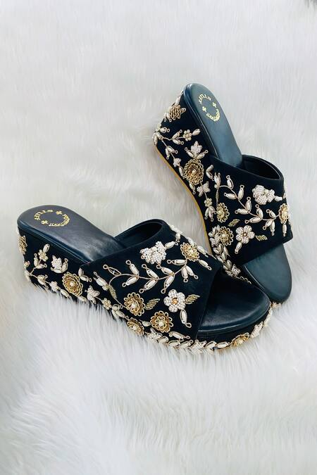 Black wedges featuring floral embroidery in zari, bead, and thread work