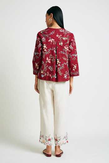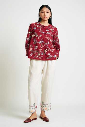 Maroon Cotton Handloom Floral Motifs, Jaal Work Round Peony Embroidered Jacket