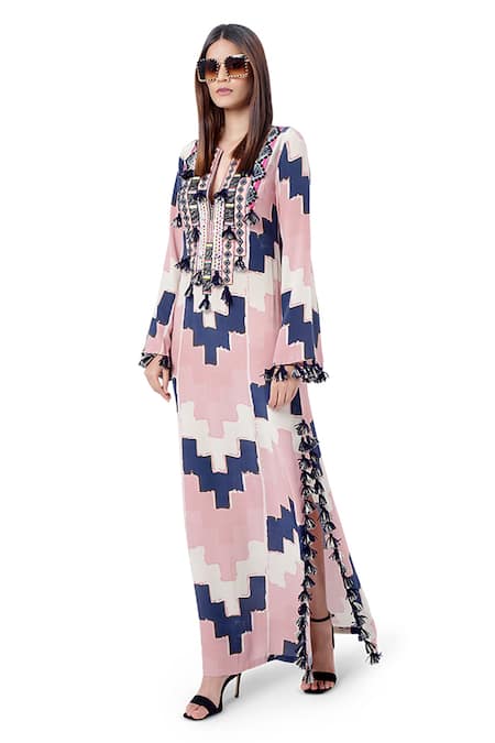 Blush pink kaftan in crepe base with mosaic ladder print, embroidered yoke, high-slit with tassel detailing.
