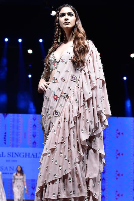 Rose pink georgette frill saree with embroidered motifs. Paired with embroidered choli & petticoat.