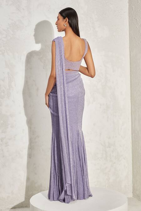 Purple Crepe Embroidery Pearl Gathered Pre-draped Saree