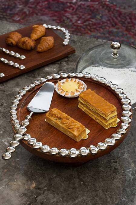 Nickel cake server crafted from stainless steel, with circular shapes in linear pattern.