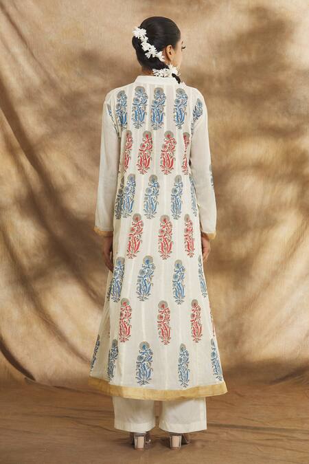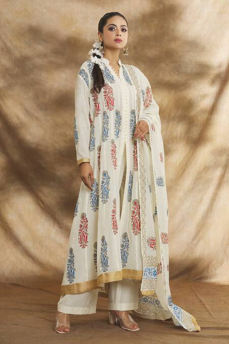 Cream kurta featuring an all-over floral block print with a band collar and full sleeves. Paired with a matching pant and dupatta, it includes a potli button placket and slit detailing.