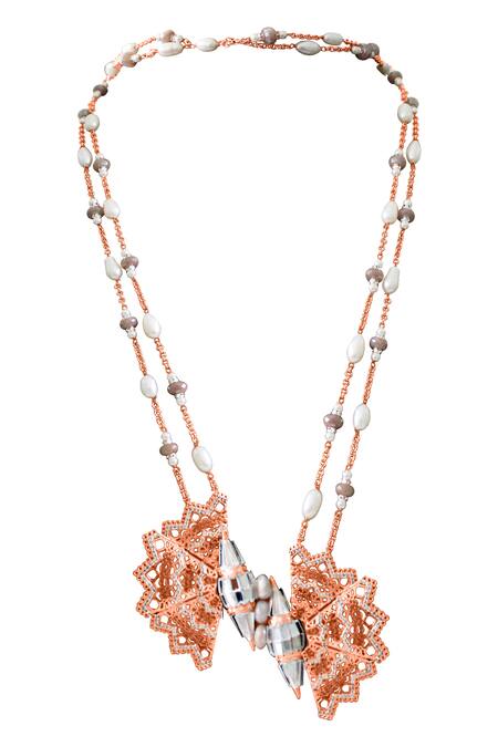 18K rose gold plated layered long necklace with multi-bead strings, encrusted Swarovski stones & carved detail.