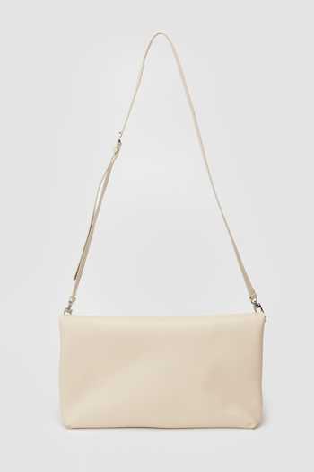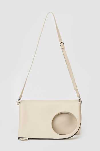 Cream leather handbag with sculpted circular handles and a minimalist silhouette. The spacious main compartment and dual detachable straps enable tote, cross-body or clutch carry for everyday versatility.