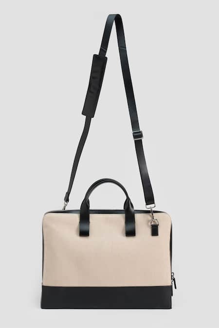 Cream designer laptop bag featuring adjustable shoulder straps and sturdy handheld handles