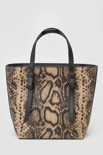 Beige tote bag crafted from premium reptile-print leather, with a structured silhouette and spacious interior. Sturdy top handles and an adjustable crossbody strap offer versatile styling.