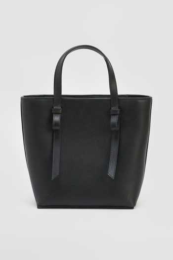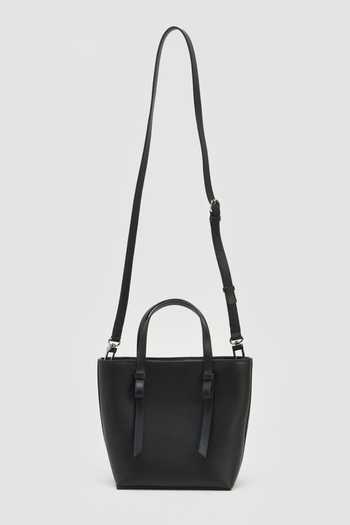 Black 100% Italian leather handbag with top handles and a detachable adjustable shoulder strap.