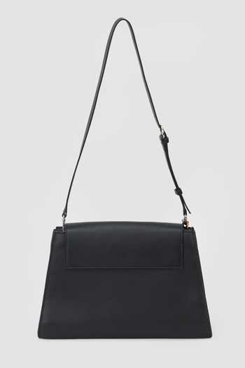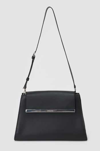 Black structured shoulder bag crafted from smooth premium leather, featuring clean lines and a subtle metallic bar on the flap. It has dual compartments, a central zip pocket and a back slip pocket, secured with a magnetic snap and an adjustable strap for versatile wear.