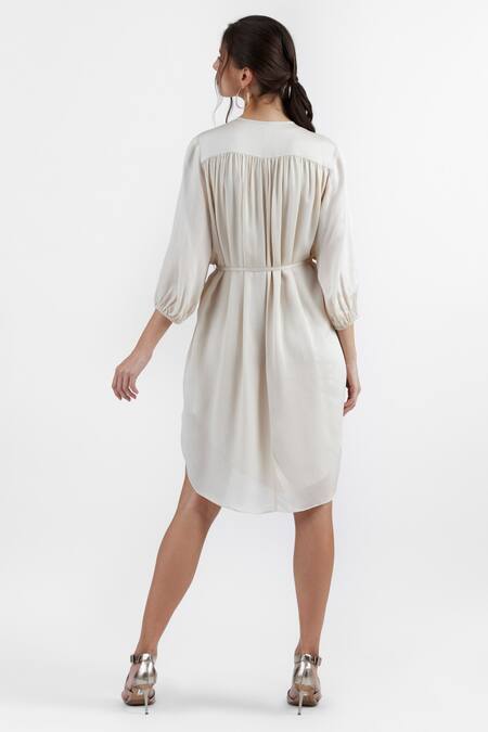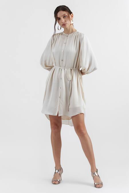 Ivory pleated A-line dress featuring a band collar and front button closure