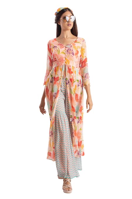 Multi colored long gathered tunic in petals print, enhanced with delicate sequins & pearls. Paired with chevron print sharara.