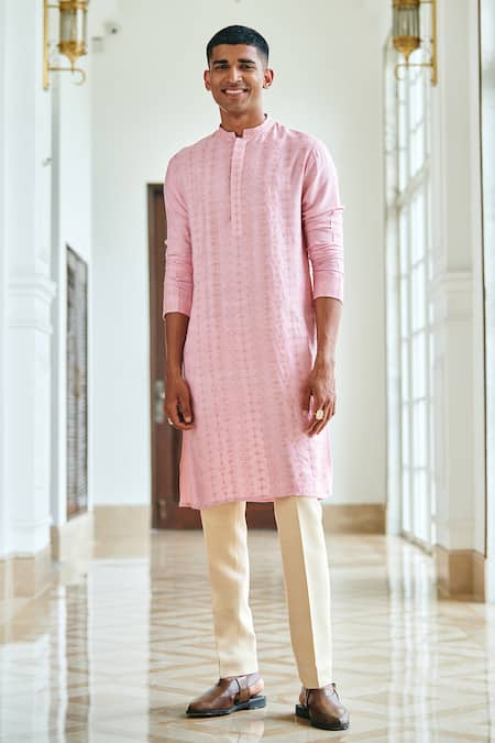 Candyfloss pink silk kurta featuring full sleeves and tonal floral stripe pattern thread embroidery
