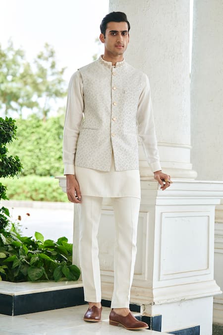 Metallic buttons, Cut dana embroidered collar, Geometric pattern threads