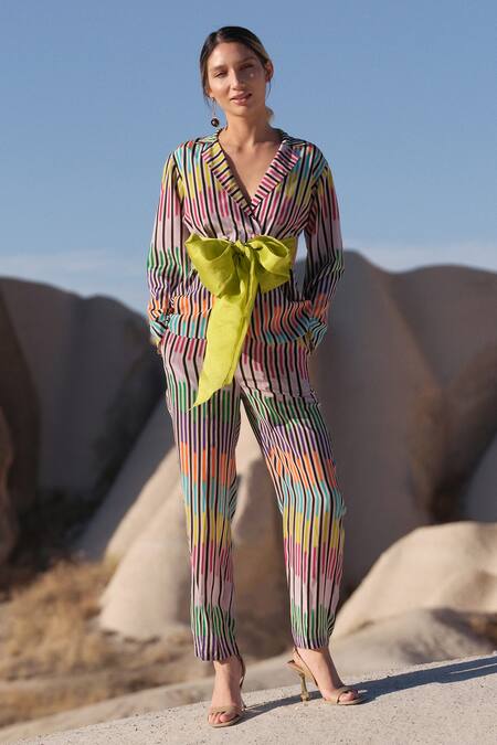 Multicolor blazer with all-over chevron print, lapel collar and contrast bow in front. Comes with co-ordinating straight pants.