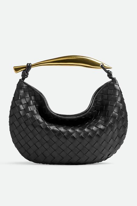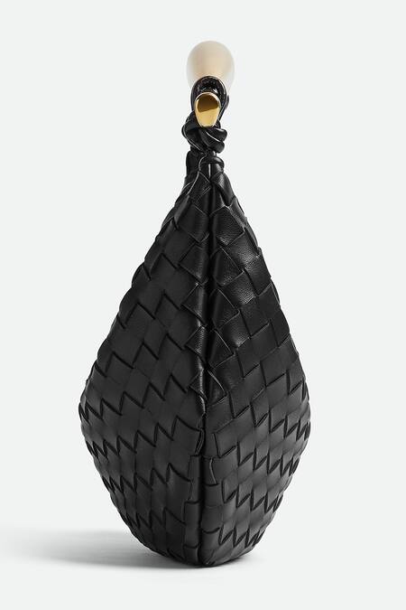 Black leather bag with basket weave pattern & sculptural metallic top handle.