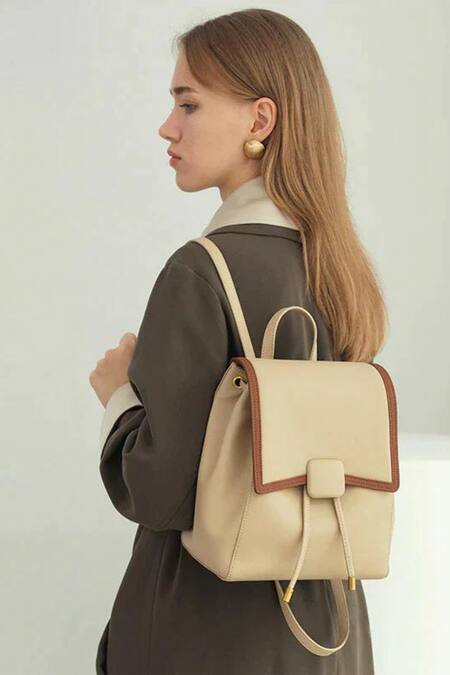 Cream leather backpack featuring a square shape with adjustable straps and a drawstring closure