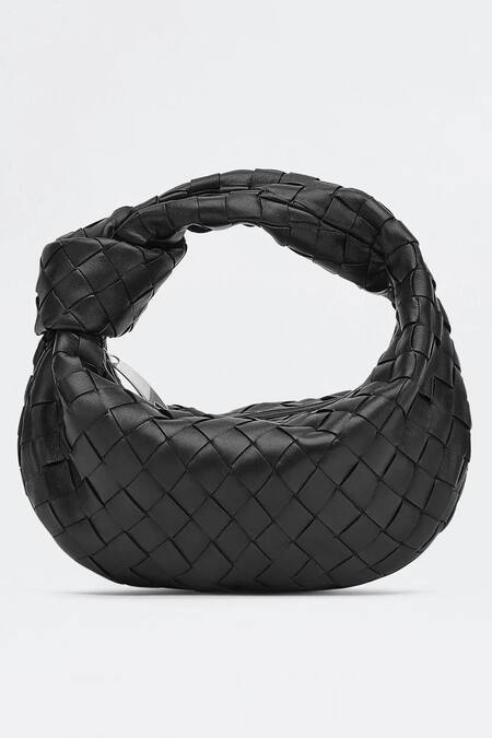 Black handbag crafted in leather featuring a round shape and signature knot