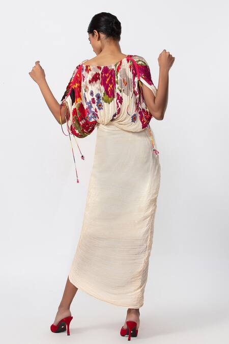 Ivory Cotton, Silk Ruffles V-neck Placement Print Draped Dress