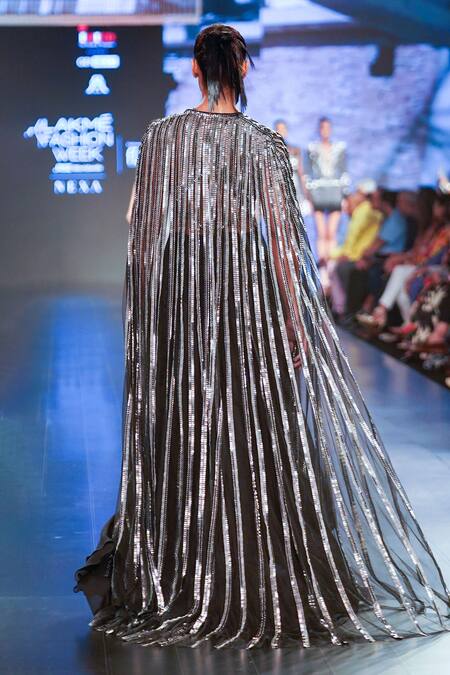 Gunmetal sheer gown featuring plastic sequin embellishments on the bodice and a flowing black georgette skirt