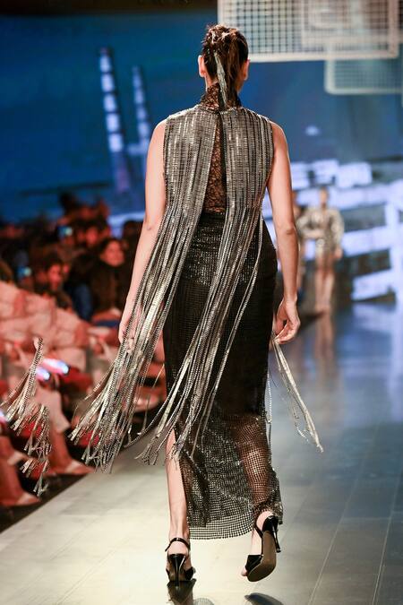 Gunmetal plastic sequin trim tassels, Backless design, Front concealed placket
