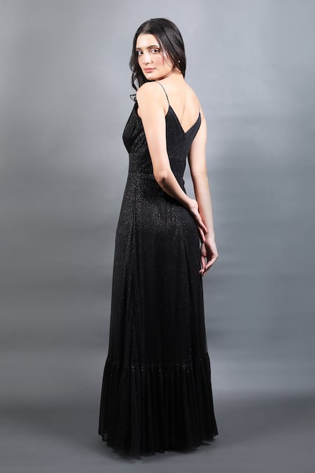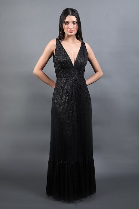 Black gown featuring a plunging V neckline and pleated hem