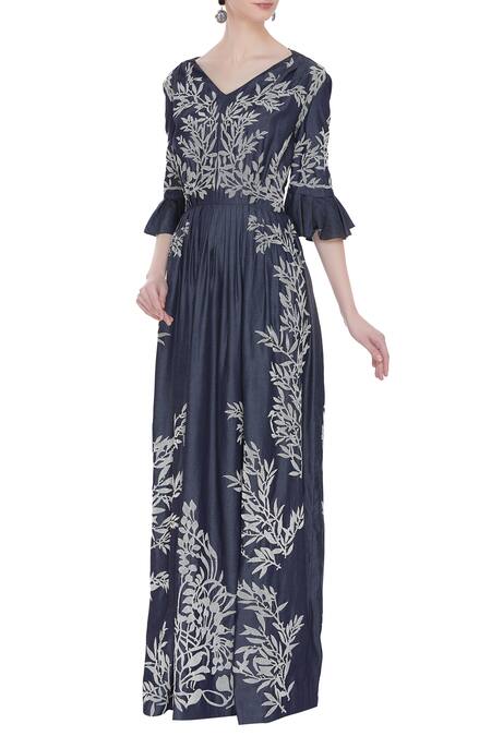 This eye-catching and striking grey maxi dress is enhanced with applique work all over.