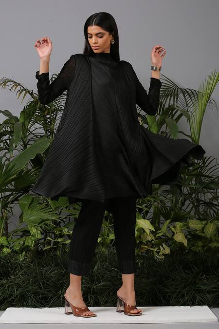 Black high neck tunic with crushed sleeves and asymmetrical hem. Comes with matching straight pants.