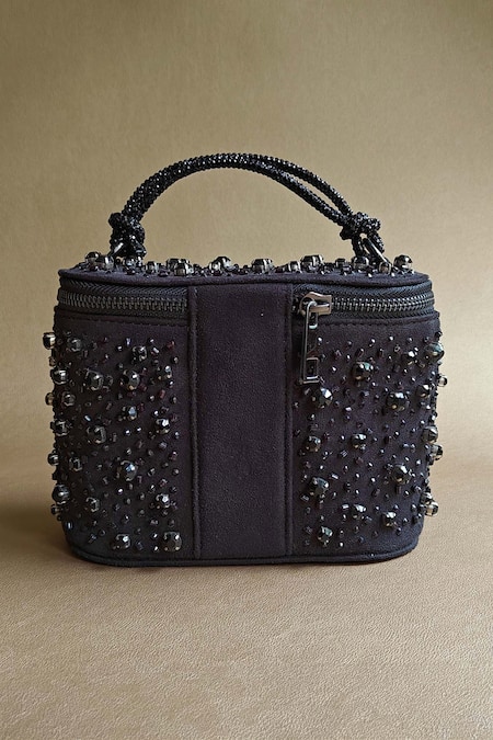 Black vanity bag featuring stone studded embellishments and a round handle on top