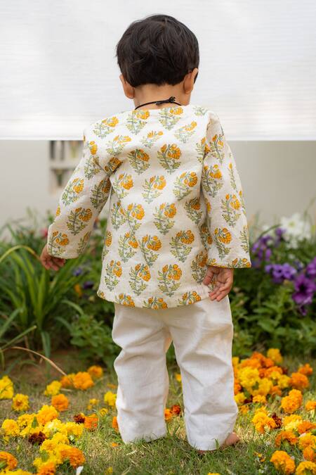Yellow kurta featuring all-over marigold hand block print with full sleeves and round neckline. Paired with a dhoti, swaddle, mittens, and booties.