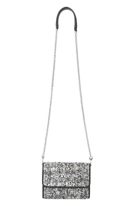 Checkered pattern sequin and boucle fabric embellishment, Silver detachable cross-body chain, Leather panel on chain