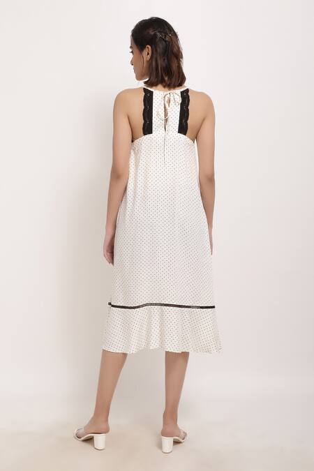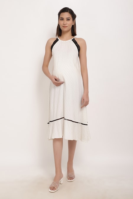 White halter neck maternity dress with polka dot print and black lace trims on the sleeves.