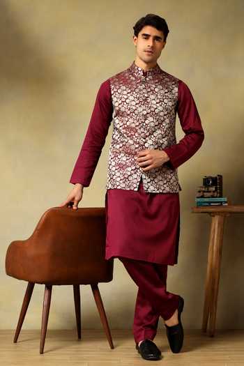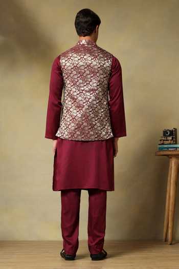 Maroon kurta set features a brocade bundi with floral metallic motifs and a Dola silk kurta. Comes with a matching pyjama.