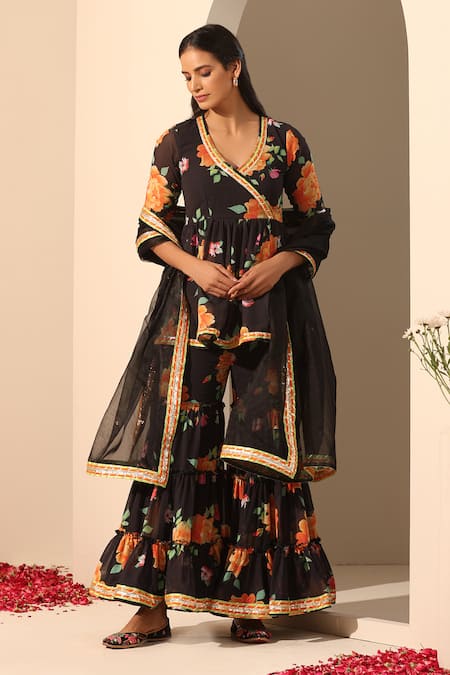Black kurta featuring floral embroidery and gota lace detailing. Paired with a sharara and dupatta.