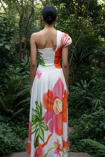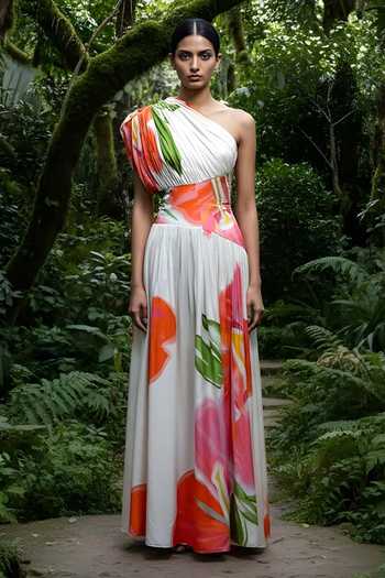 White Bemberg Asymmetric, One Shoulder Floral Printed Pleated Dress