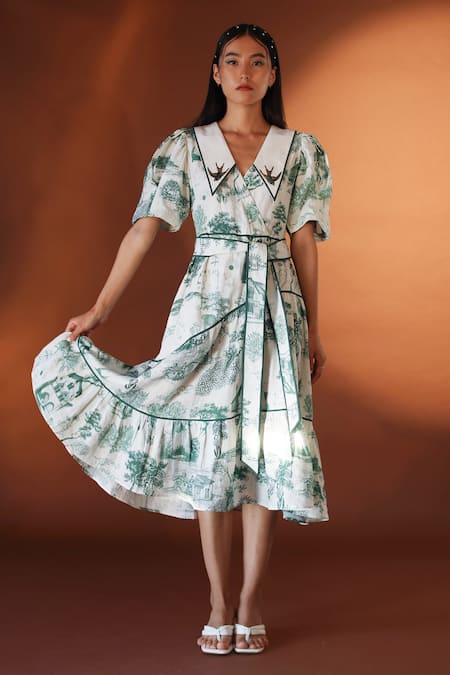 White pure hemp floral printed tiered midi dress with embroidered collar.