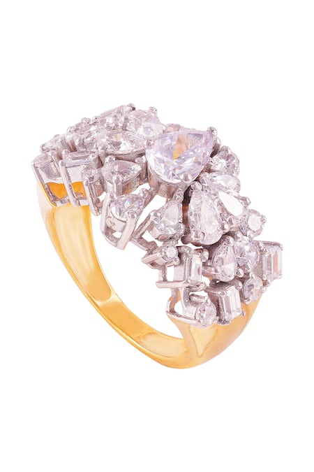 Carved pattern design with a mix of stone shapes., Cubic zirconia in various cuts for added brilliance.